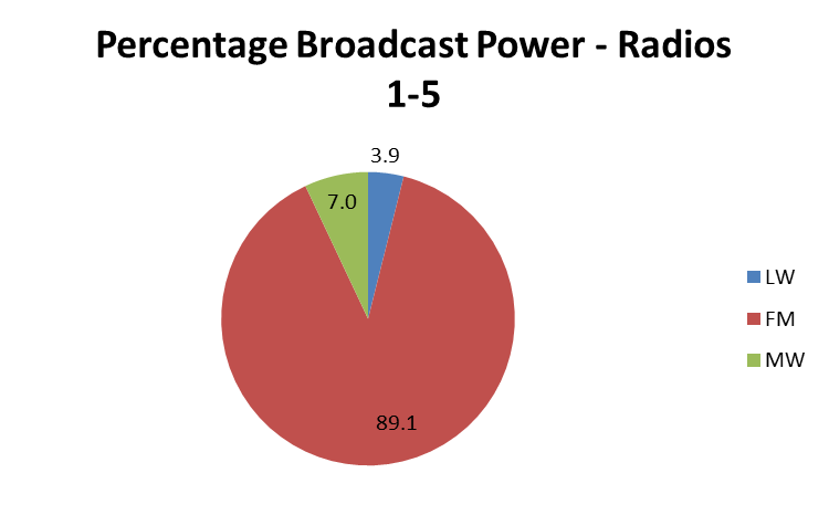 BBC Radio 4 is just one of 5 national networks that the BBC broadcasts on analogue radio. The report also looked at the percentage of the total power output of BBC analogue radio that longwave accounts for. This meant adding up the power requirements of all the FM transmitters for BBC Radios 1-4, and the MW transmitters for Radio 5. Figure 2 shows the results.