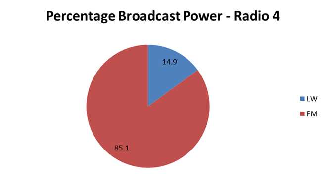 The combined power output of the three longwave transmitters at Droitwich, Burghead and Westeglen, meanwhile, is just 0.6 Mega-Watts, which is around 1/6 of the FM output. This is to provide clear, reliable coverage to essentially 100% of the UK population. Figure 1 shows the percentage of the total broadcast power output of BBC Radio 4 attributable to each of FM and LW. It shows that LW is much more efficient, requiring just 15% of the total power to provide more coverage than FM, which accounts for the remaining 85%.